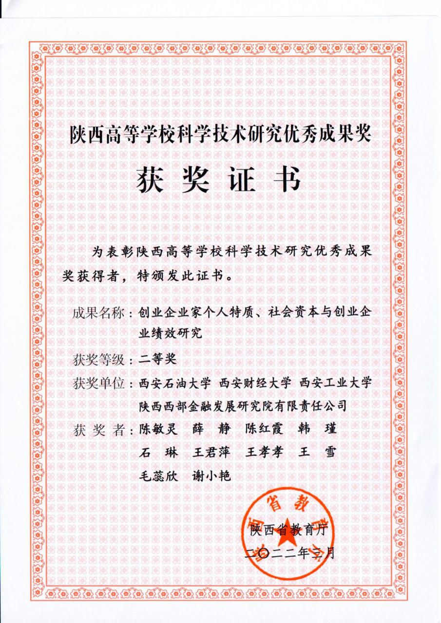 2022年2月,陕西省教育厅公布了陕西省高等学校科学技术研究优秀成果奖获奖名单,我校陈敏灵、薛静老师的研究报告《创业者个人特质、社会资本与创业企业绩效研究》获得二等奖。