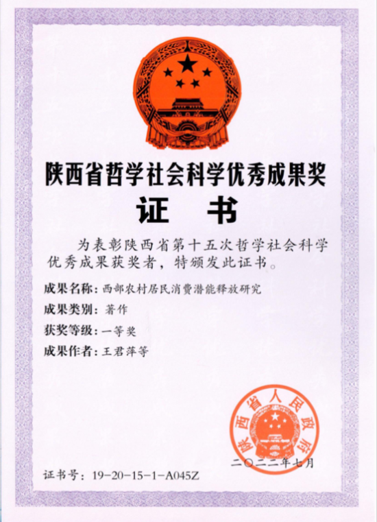 近日,陕西省人民政府公布了第十五次哲学社会科学优秀成果获奖名单,我院王君萍教授团队的专著《西部农村居民消费潜能释放研究》获得著作类一等奖。