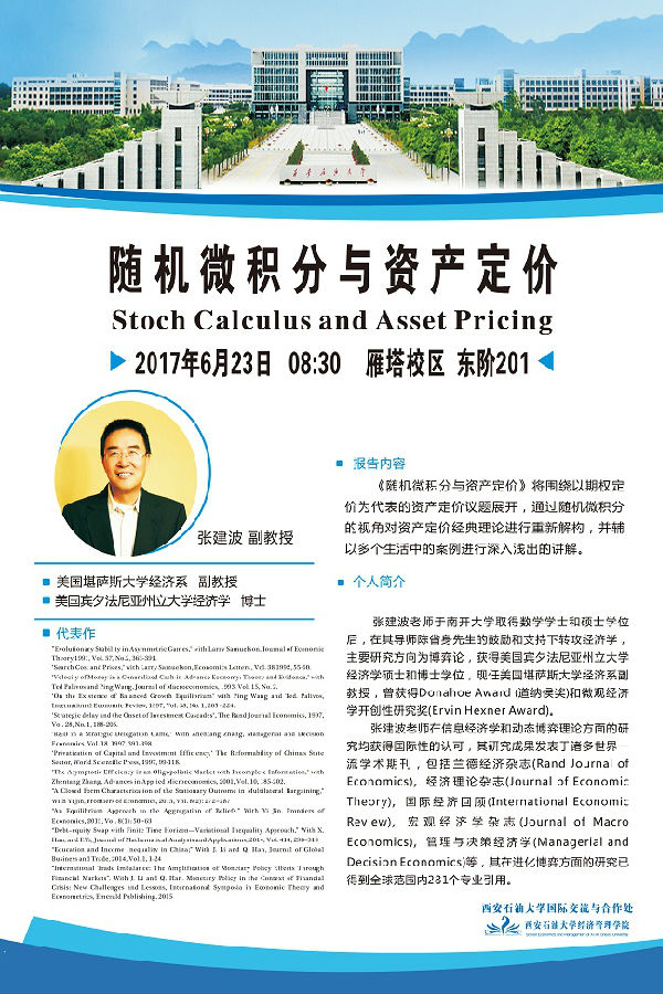 应我校国际合作交流处和经济管理学院的邀请,美国堪萨斯大学经济系张建波教授将来我校进行名为《随机微积分与资产定价》的学术报告。此次报告将围绕以期权定价为代表的资产定价议题展开,通过随机微积分的视角对资产定价经典理论进行重新解构,并辅以多个生活中的案例进行深入浅出的讲解。