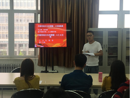 会议分为两部分,首先进行的是组织委员鲁运海同志参加支部书记讲党课比赛的PPT展示。他就“文化自信”及当代大学生自信心的培养进行讲述,基于古今文化和社会发展,结合大学生自身特点表明了作为当代大学生党员,我们要提高文化素养、讲究奉献精神,担负起民族复兴的希望,为国家和社会的进步添砖加瓦。