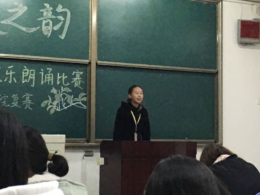 本次比赛以“风雅之音,感怀人生”为主题,采取百分制,高分获得者将代表我院进入校级比赛的角逐。选手们的参赛节目风格各异,或单人,或团体,表现形式多样。比赛开篇是由郭茜同学为我们带来的《雷电颂》,铿锵有力、激情高昂;高钰与王心怡同学的《我在秋天里行走》,文艺而饱含深情;而朱思敏和郭禹希同学对《我的心》的精彩演绎更是赢得了现场同学热烈的掌声;初然和朱涵同学以一首《我骄傲,我是中国人》为现场同学送上了一场视听盛宴,雄壮激昂的音乐、抑扬顿挫的朗诵,二者相得益彰;李乐同学的《雨巷》则把观众引入了那条寂静幽长的小巷,让大家遇见了那位丁香般的姑娘。最后,焦倩同学一首洋溢着青春气息的《青春万岁》为选手们的表演拉上帷幕。赛后,由李国玺学长、董子瑜学姐为大家带来了精彩的朗诵表演,展示出他们深厚的朗诵功底,得到现场同学的阵阵掌声。