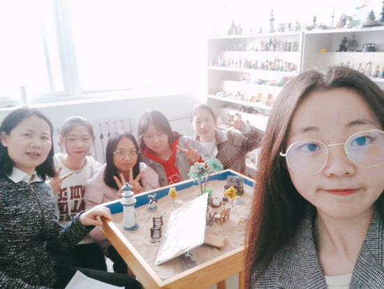 之后,老师又引导我们做了“沙滩实验”,让同学们静下心来,自己摆放物品展示真实的自己。同学们都摆放了各式各样的图案,并说出了自己的心声。