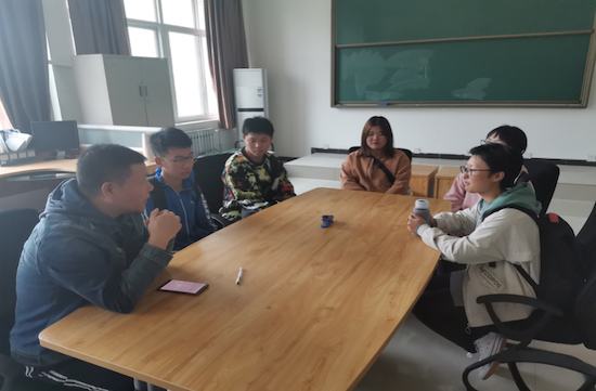 2019年10月14日中午,经济管理学院金融学1901班的狄巧芸、马洪、庞俊楠、陈荣欢、冯佳、姜雨卓、贺艺豪六名同学在经管人文楼203教室与杨欣导师见面讨论问题。