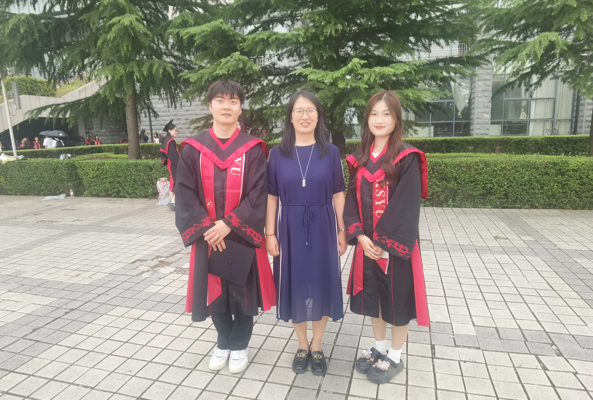 当日阳光和煦,图书馆前的绿植生机勃勃,学生们身着整齐的学士服,与李老师并肩而立。快门按下的瞬间,定格了师生们亲密无间的情谊,也记录下这一充满纪念意义的时刻。