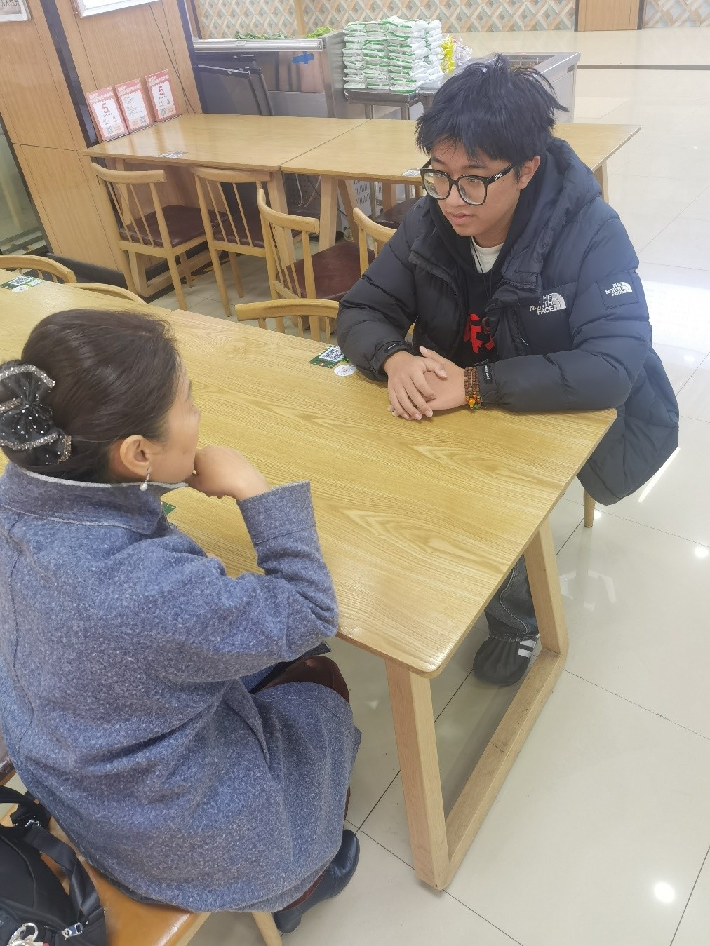 2025年12月2日中午,A区食堂的2楼,来自商管2302的谢朋程同学和李继翠老师在谈这两年学习情况,尤其是自己的各项社会实践,以及未来的规划,显得很兴奋,李老师认真听着这位来自安徽的小伙子快乐的讲述,看着从大一一点点成长起来的大三学生很是欣慰。