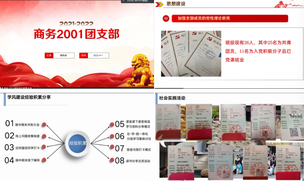 百年岁月,栉风沐雨,共青团始终坚定不移跟党走,团结带领共青团员和广大青年前赴后继、勇当先锋,书写了中国青年运动的华章。作为新时代的接班人,共青团建设的参与者,经济管理学院各团支部积极准备“五四红旗团支部”答辩汇报,牢记历史使命与时代精神,以联系青年、服务青年、凝聚青年为核心,以彰显中国共青团员良好风貌为目标,各团支部就学风建设、组织建设、思想政治、科创文体等方面进行汇报,充分展示了团支部成员们爱党爱国爱团的政治素养、奋发向上的学习风气、井然有序的组织建设以及朝气蓬勃的文体氛围。