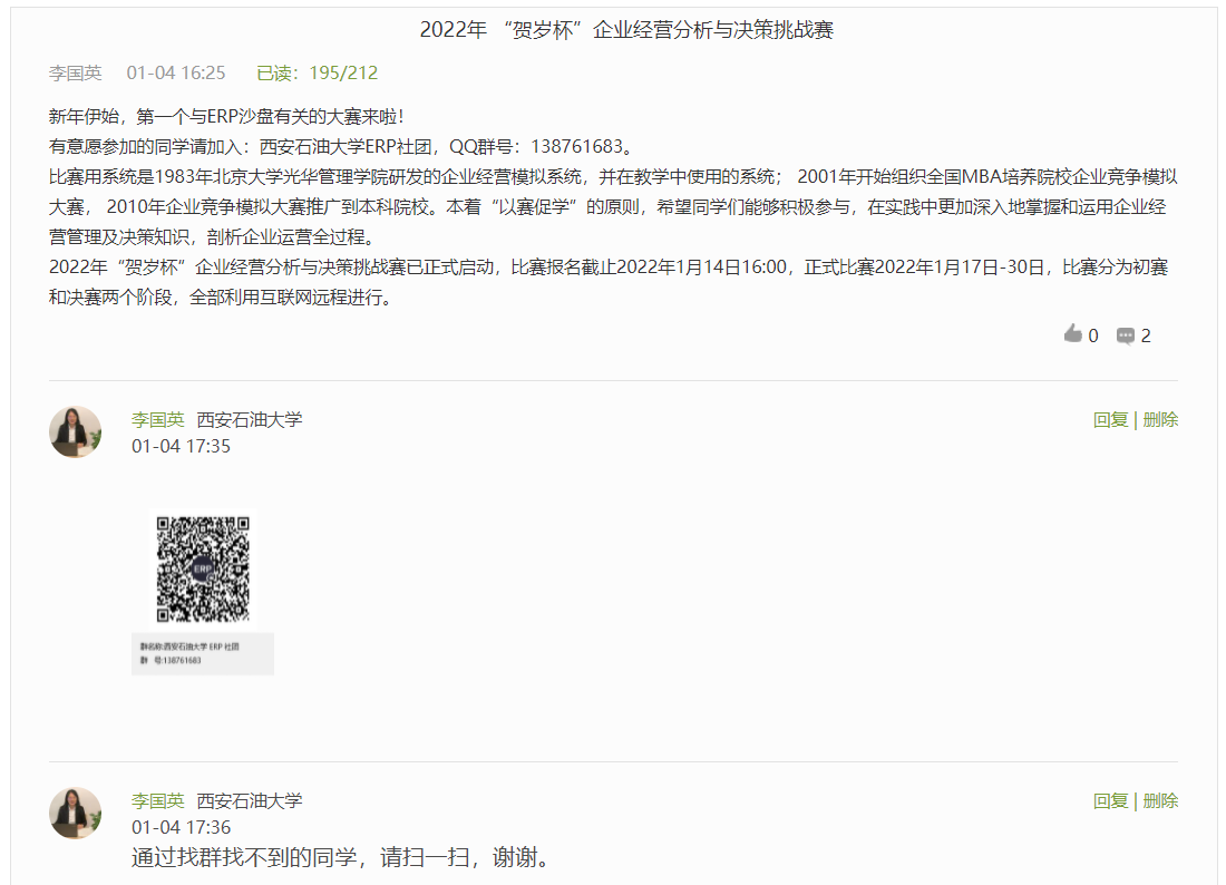 为学习贯彻全国教育大会精神,全面落实《国务院办公厅关于深化高等学校创新创业教育改革的实施意见》要求,推动实践教学育人,加强创业就业教育,培养学生创新能力,通过“以赛促教、以赛促学、赛教结合”,提高人才培养质量,让学生在复杂多变的环境中探索企业生存与发展的企业家精神,经济管理学院管理科学与工程系李国英等老师成立了西安石油大学ERP社团,并组织来自经济管理学院信息管理与信息系统、电子商务、市场营销、会计、金融、人力资源等专业的36位社团同学组成了12个小组,报名参加中国管理现代化研究会决策模拟专业委员会组织的2022年“贺岁杯”企业经营分析与决策大赛。