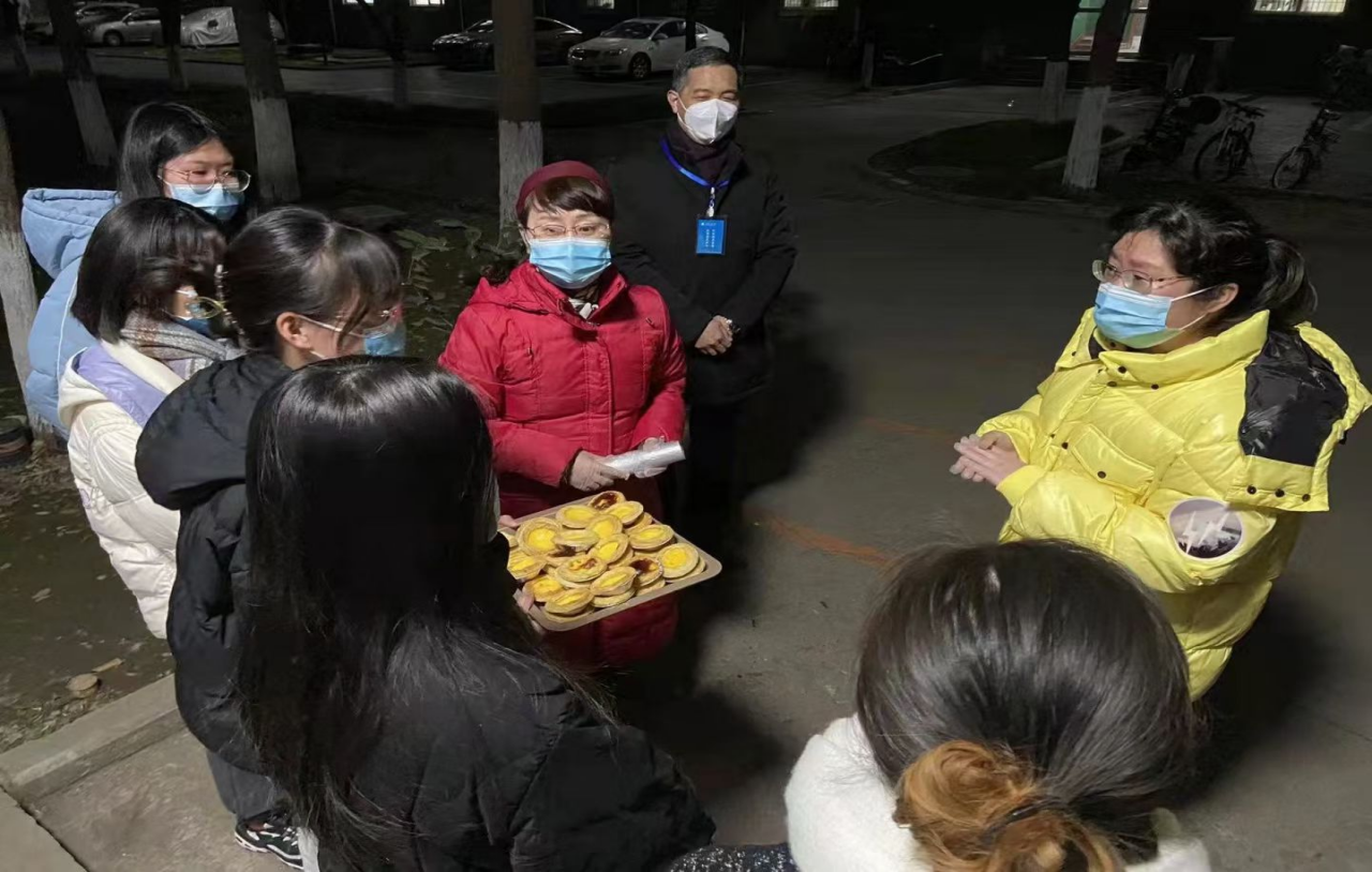 经济管理学院人力资源管理系的研究生导师朱海娟老师平时就是个热爱烘焙的美食家,在跨年夜她想到志愿者们连日的辛苦,因此她利用自己家里的牛奶和鸡蛋,花了一下午时间烘培了四烤箱蛋挞,和人力系党支部的杨睿娟老师一起送给了留守在宿舍里的志愿者们品尝,在这个寒冬为同学们带去了导师们和党支部的问候,对志愿者勇于担当、冲锋在前的精神表示感谢。香甜的蛋挞带着导师们的关怀,赋予同学们力量,在这跨年之夜带来了浓浓暖意。我们相信,万众一心,众志成城,师生一起克服疫情带来的各种困难,在大家的共同努力下,温暖的春天很快就会到来。