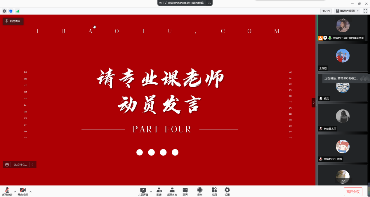 为弘扬抗疫精神,体现青年担当,经济管理学院2019级市场营销专业于1月10日开展“山河无恙、人间有情”线上专业教育会。经济管理学院院长王君萍、党委副书记王刚,企业管理系主任杨晶、班主任袁静、辅导员王璟以及2019级市场营销专业全体同学参与会议。会议由营销1901班班长吴红娟主持。