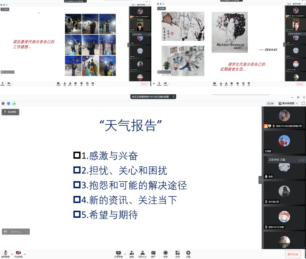 市场营销专业学生志愿者代表杨辉中、瞿力渊同学与大家分享了志愿服务过程中的心得与收获,他们积极动员学生干部投身疫情防控志愿服务工作,在宿舍楼值班值守、核酸检测组织、防疫物资搬运中都有他们的身影。学生代表王彪、努尔曼·古丽分别分享了疫情防控期间的日常宿舍生活。