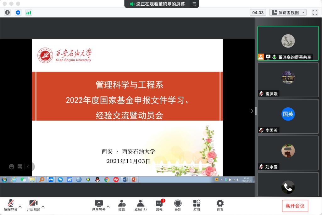 11月3日,经济管理学院管科系2022年国家基金申报文件学习与经验交流会在线上召开,副院长李俊亭、管科系主任董鸣皋及管科系全体教师参加了会议。此次会议的目的是集体学习学校相关文件精神,落实学校2022年国家基金项目申报工作安排,交流、解决教师在国家基金申报中遇到的问题和困难,为进一步推动基金申报工作顺利开展奠定基础。