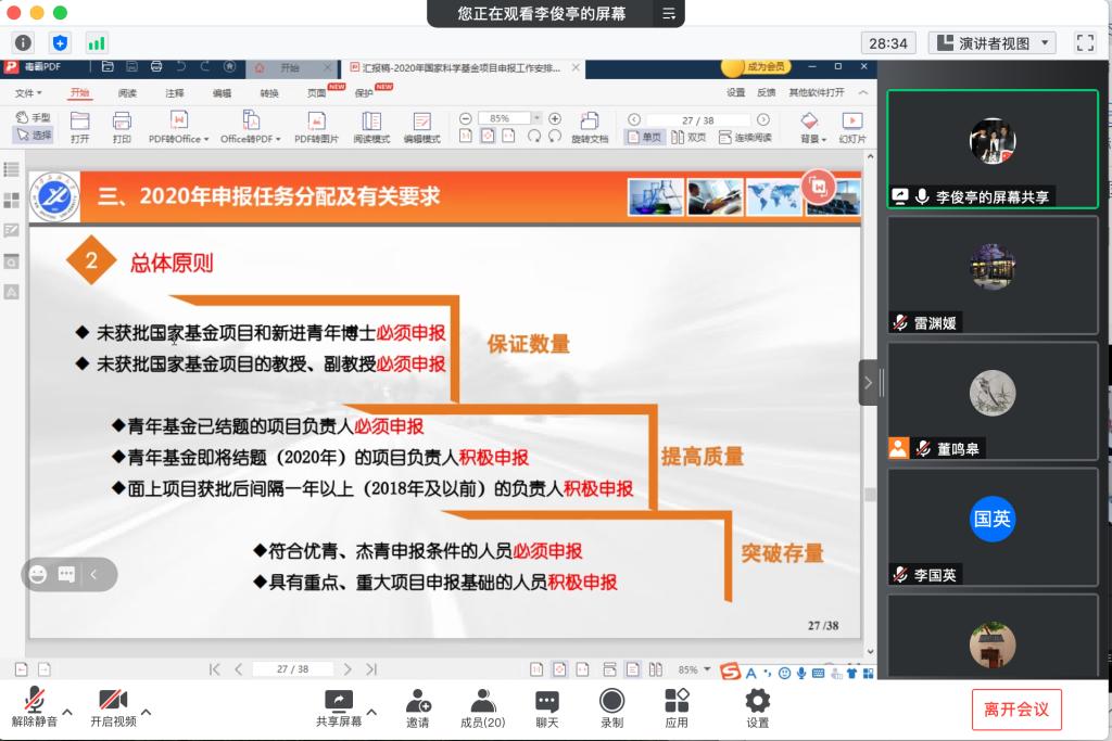 会上,副院长李俊亭就近三年学院科研工作情况对学院国家基金项目申报情况及形势作了介绍,并对国家基金申报的要求、学院科研的主要做法、成效及原因进行分析,对今年申报政策变化做了解读。