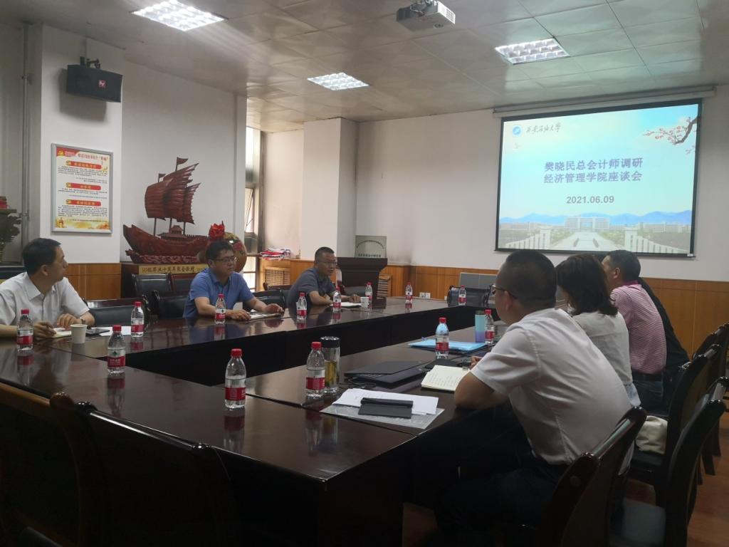 6月9日,樊晓民总会计师一行到经济管理学院调研座谈,财务处处长范宏、审计处处长李国柱陪同调研,经济管理学院党委书记王宏卫、院长王君萍、副书记王刚、副院长吴勋参加座谈会。