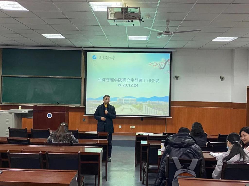 学术报告结束后,经济管理学院召开了硕士研究生导师工作会议。经济管理学院院长王君萍教授首先对研究生导师在研究生培养过程中的责任进行了强调,她指出应充分发挥导师在研究生教书育人中的第一责任人作用,在切实加强研究生思想政治教育工作的同时,也要充分保证研究生的培养质量。导师应在学生开题报告、中期检查、毕业答辩的培养全过程发挥作用,防止把“相应责任”泛化理解、片面化认定、极端化执行。