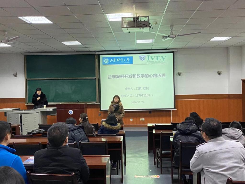 12月24日上午,山东财经大学工商管理学院教授、加拿大西安大略大学毅伟商学院兼职教授、鲁商案例研发中心主任刘素教授在2号教学楼东阶201教室作了题为《管理案例开发和教学的心路历程》的学术报告。主管研究生教学工作的李俊亭副院长主持了报告会,王君萍院长和经济管理学院专业硕士指导教师等近30人参加。