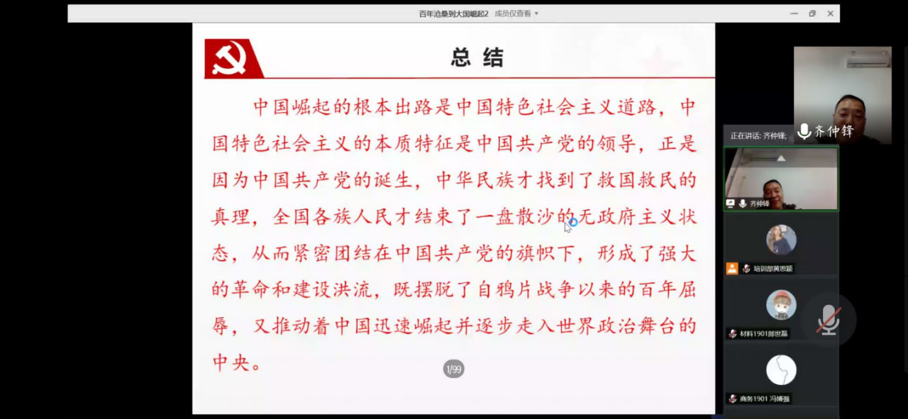 5月28日晚,经济管理学院第四十五期入党积极分子培训班第一讲通过腾讯会议APP平台,以线上授课的方式顺利举行。材料科学与工程学院党委书记齐仲锋以《从百年沧桑到大国崛起》为题担任主讲,经济管理学院同材料科学与工程学院近300名入党积极分子参加。