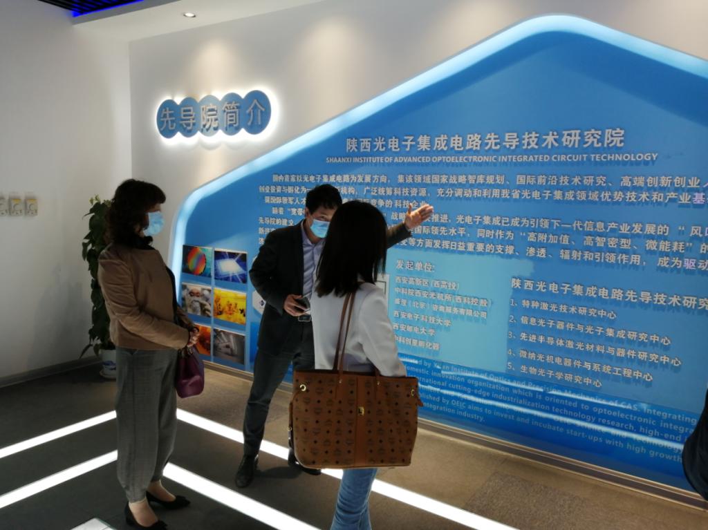 在光电子集成专业化众创空间,调研组重点了解了陕西光电集成电路先导技术研究院的发展情况,特别是政府引导、金融资本、民间投资共建的光电子基金在创新科技金融体系、加速成果转化应用中的重要作用,及其对陕西省众创空间借助金融工具实现高质量发展的成功经验。