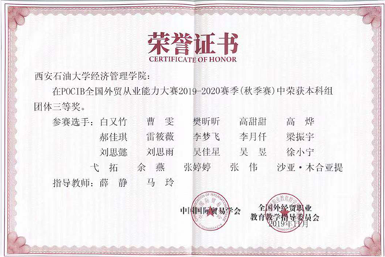 在长达20天的马拉松式赛程中,在姚小剑、薛静、马玲、康霏等四位老师指导下,经济管理学院国贸专业17级40余名参赛同学共同努力、相互鼓励,最终取得团体三等奖的成绩。参赛同学中张婷婷同学获得个人一等奖,白又竹、刘思懿、李梦飞、时李娜、朱亚蕊、亢思敏等6位同学获得个人三等奖。