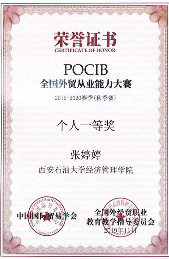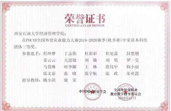 11月7日至26日,由中国国际贸易学会、全国外经贸职业教育教学指导委员会主办的2019-2020赛季第九届POCIB全国大学生外贸从业能力大赛总决赛如期举行。此次竞赛共有来自227所院校的304支队伍、6080名选手参赛,经济管理学院选派两支队伍参加比赛。