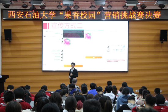 2019年11月18日晚,由校团委和经济管理学院主办,经济管理学院企业管理教工党支部、企业管理学生党支部和营销协会承办的首届“果香校园”营销挑战赛决赛在鄠邑校区经管人文楼118成功举办。经济管理学院院长王君萍、企业管理系全体教师、学院部分学工干部、企业管理学生党支部全体成员、营销协会会员和参赛选手共300余名师生参加了本次活动。