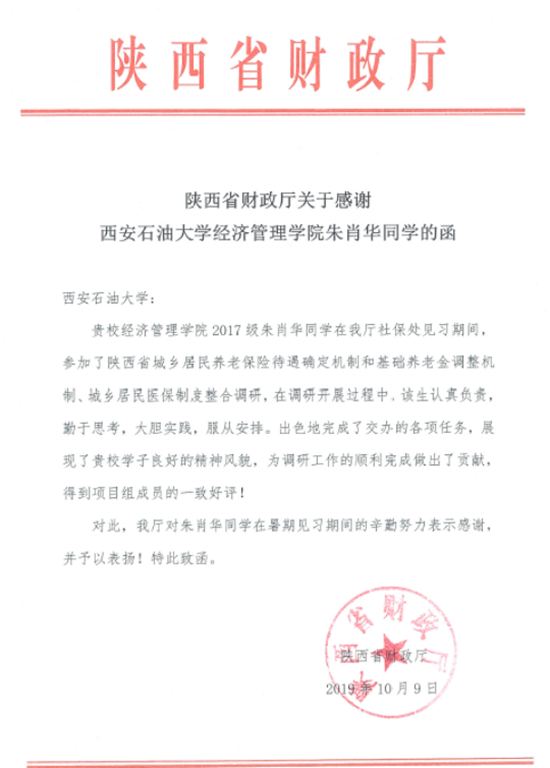 近日,陕西省财政厅向我校经济管理学院发来感谢函,对我校2017级会计专业硕士朱肖华同学提出表扬,高度评价该同学在暑期见习期间的工作表现。