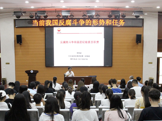 为不断增强党性观念和廉洁从政意识,充分发挥基层党支部纪检委员的作用,7月2日下午,经济管理学院党委“当前我国反腐斗争的形势和任务”专题讲座在鄠邑校区就业指导中心多功能厅举办。本次讲座由长庆油田公司纪委派驻第一纪检组组长兼巡察组组长李秋波同志担任主讲,经济管理学院党委书记闫大维同志主持,教工党员、学生党员和入党积极分子代表共两百余人参加。