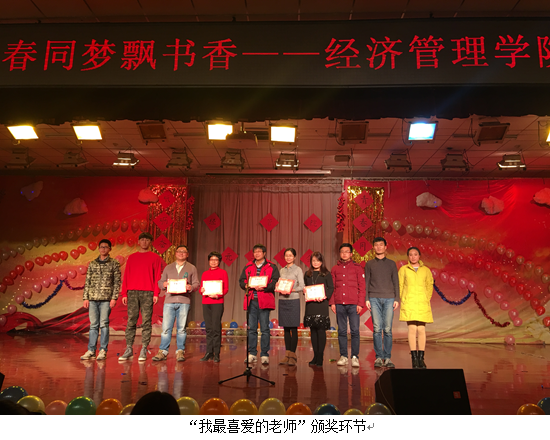 “我最喜爱的老师”颁奖把晚会带到了高潮。获奖的老师分别是陈丁、董春诗、苟三勇、巩前胜、郝上京(理学院)、黄莉、侯珂、李立群、刘松华、刘永爱、牛波、王毓军、肖焰、尹志国、郑蕊。由同学为我们的获奖老师颁奖。