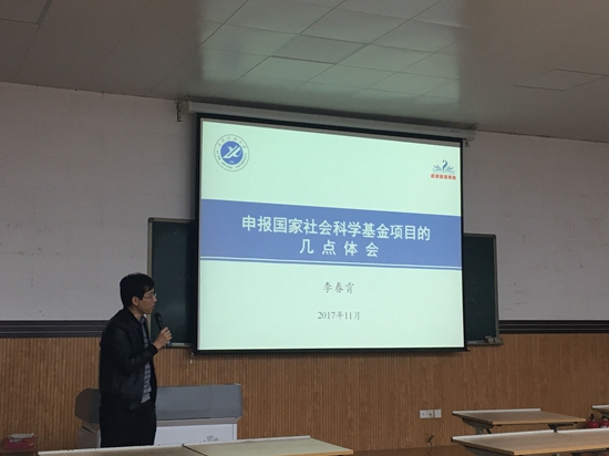 李春霄博士在题为《申报国家社会科学基金项目的几点体会》的报告中介绍了2017年国家社科基金年度项目和青年项目立项情况及评审程序,结合他本人2016年、2017年连续申报国家社科项目的失与得以及自我升华的过程,从选题、论证、研究基础、注意事项等几方面做了具体的分析与总结。