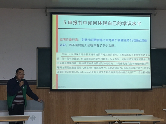 吴勋博士详细分享了活页书写作的经验和体会。他在报告中以本人书写活页书为例,从研究内容、研究重点、难点、目标、思路方法、创新之处、预期成果详细讲解了自己的设想、撰写并如何修改和提升个人的活页书。