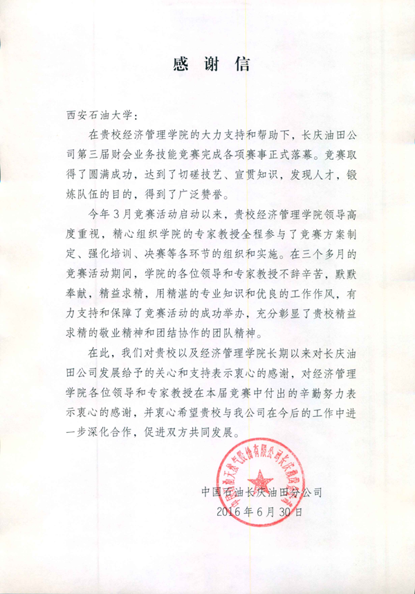 长庆油田公司就第三届财会人员专业技术能力竞赛发来感谢信