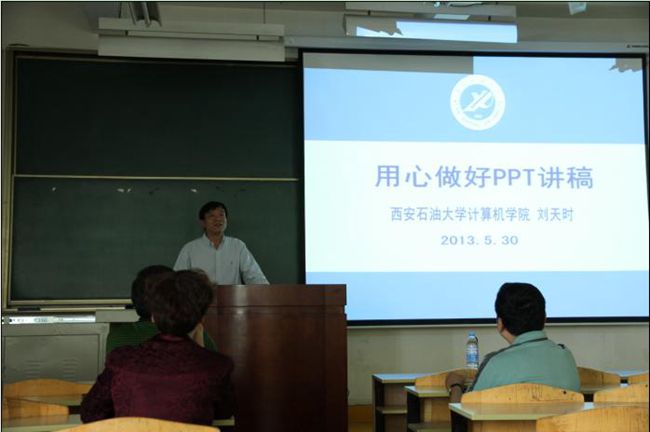 先,刘天时教授做了“用心做好PPT讲稿”的讲座,主要从多媒体制作目的、精心规划、合理布局、注意事项和使用快捷方式五个方面讲解了多媒体的制作技巧,