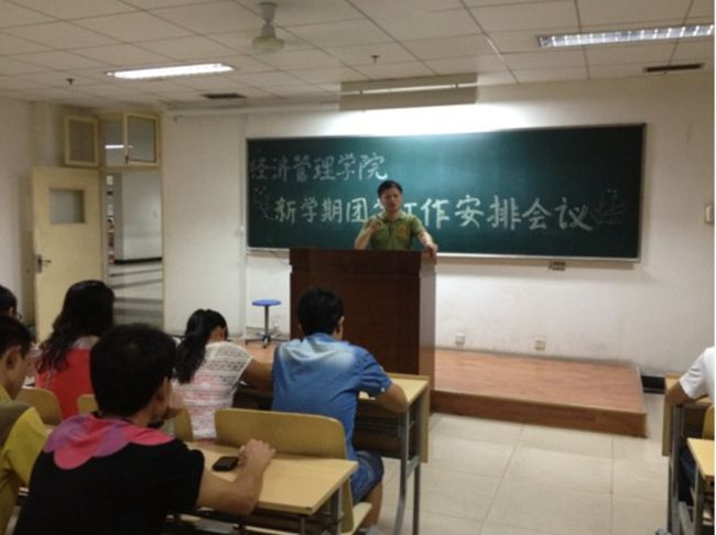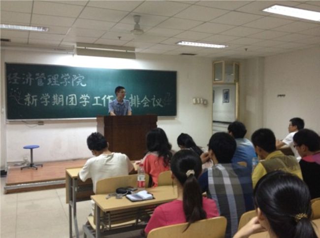 2012年9月4日晚7点半,经济管理学院在南区综合楼教室举办了新学期团学工作安排会议,会议由经济管理学院团委副书记樊晨主持,出席本次会议的有经济管理学院分党委副书记蔡强老师、2010级辅导员齐基老师以及2009、2010级学生干部。