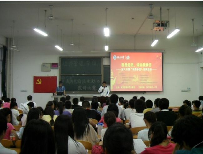 2012年6月5日,由经理管理学院分党委主办的“我是党员,请向我看齐”系列活动之“我为党旗添光彩” 主题演讲比赛在新校区B201教室举行。本次比赛旨在进一步提高广大学生党员对党的认识,激发学生党员不断加强思想学习,保持和发扬学生党员的先进性,在 班级建设、学风建设、校园文化建设中,积极发挥先锋模范作用。2010级第一党支部书记尹晓娇老师、2010级第二党支部书记齐基老师、2011级第一党 支部书记宋亚文老师,及各党支部委员出席了比赛并担任评委,来自11、10级党支部的150余名学生党员、入党积极分子观看了比赛。