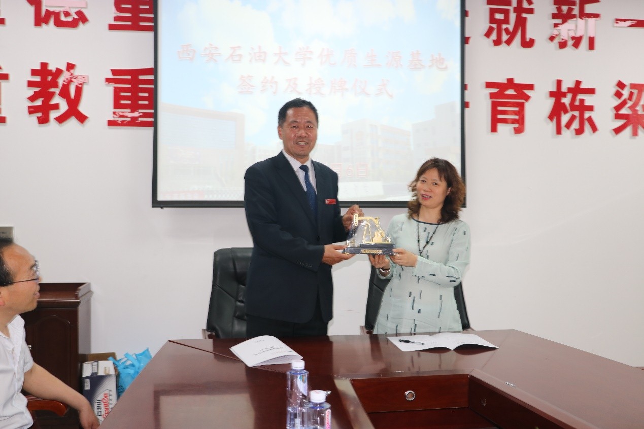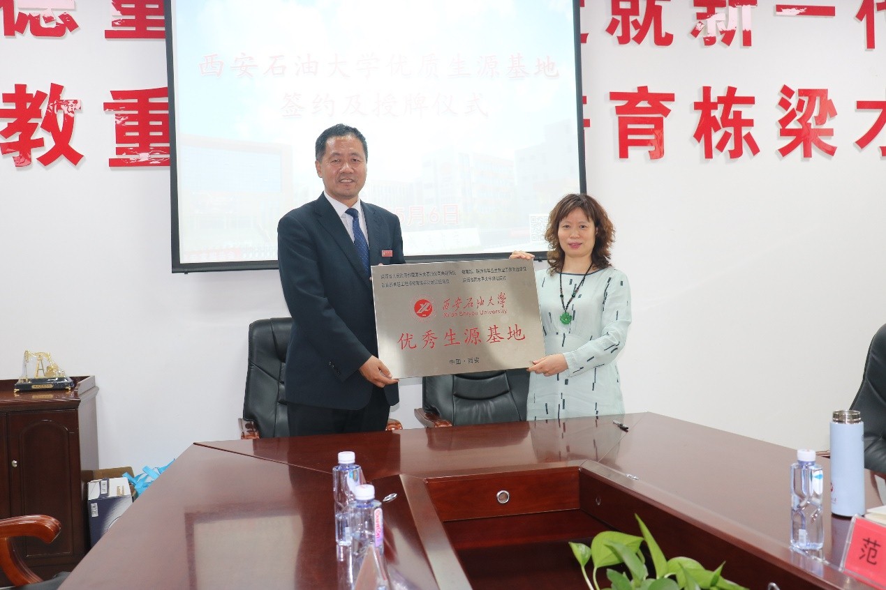 会上,双方签订了“西安石油大学优秀生源基地”协议书,王君萍代表学校向澄城县城关中学授牌。