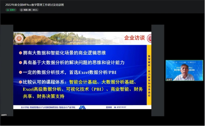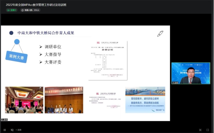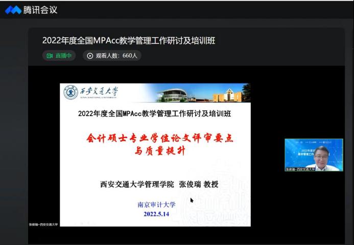 为保障我国MPAcc教育质量,提高MPAcc培养的整体水平,由全国会计专业学位研究生教育指导委员会指导、中国人民大学主办、南京审计大学承办的2022年全国MPAcc教学管理工作研讨及培训班于5月14-15日以线上方式举办,主要内容包括MPAcc教育工作总结与展望、质量认证单位MPAcc培养经验总结、论文专题主题分享等。经济管理学院院长王君萍、MPAcc专业负责人宁宇新、MPAcc专业导师、校外导师联系人等教师代表参加了此次研讨及培训班。