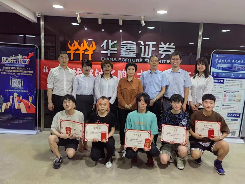 6月2日,经济管理学院第二届证券模拟交易大赛颁奖典礼在华鑫证券西安南二环营业部举行。经济管理学院党委书记王宏卫、经济学系系主任李春霄,华鑫证券西安南二环营业部总经理廖声隆、合规风控经理高军、财富总监刘智慧、业务拓展部经理蒋雯丽以及比赛获奖的6名同学出席颁奖典礼。
