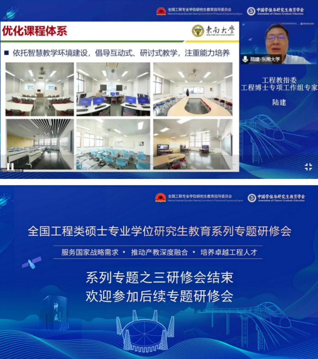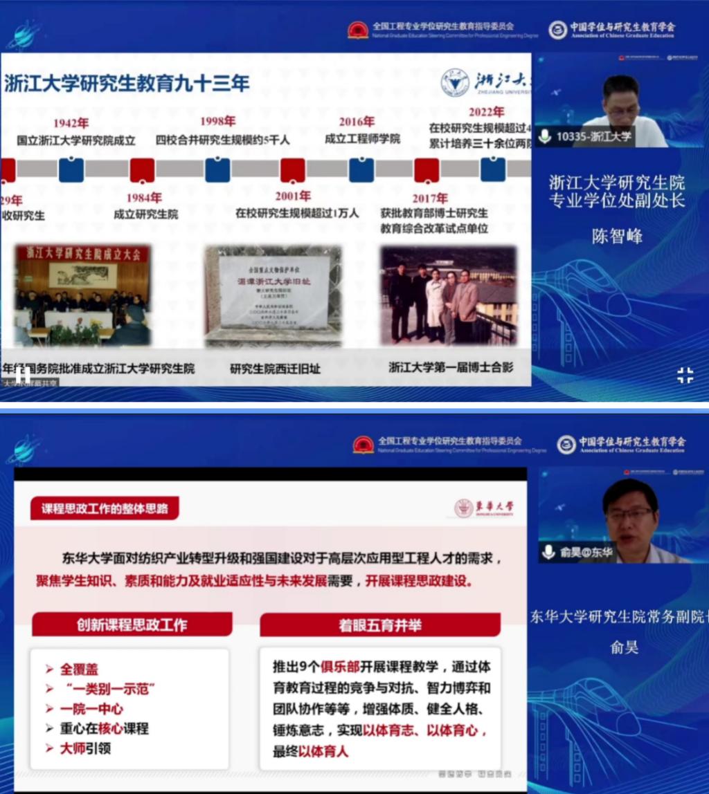 此次会议由同济大学研究生院副院长刘春、北京科技大学研究生院副院长姚志浩主持,邀请了全国工程专业学位研究生教育指导委员会副主任委员、课程建设专项工作组组长、同济大学副校长顾祥林,东华大学研究生院常务副院长俞昊,全国工程专业学位研究生教育指导委员会工程博士专项工作组专家、质量标准专项工作组专家、东南大学研究生院培养办主任陆建,浙江大学研究生院专业学位处副处长陈智峰,四川大学电气工程学院党委副书记、纪委书记张英敏,全国工程专业学位研究生教育指导委员会秘书处主任、清华大学研究生院专业学位教育办公室主任连彦青,全国工程专业学位研究生教育指导委员会秘书处主任、清华大学研究生院专业学位教育办公室主任肖志涛,中国海洋大学研究生院研究生培养办公室主任刘海波,中国海洋大学研究生院研究生培养办公室主任龙建纲,中国海洋大学研究生院研究生培养办公室主任李景叶等10位专家教授,为全国参会教师介绍了各高校在课程体系建设方面的经验。