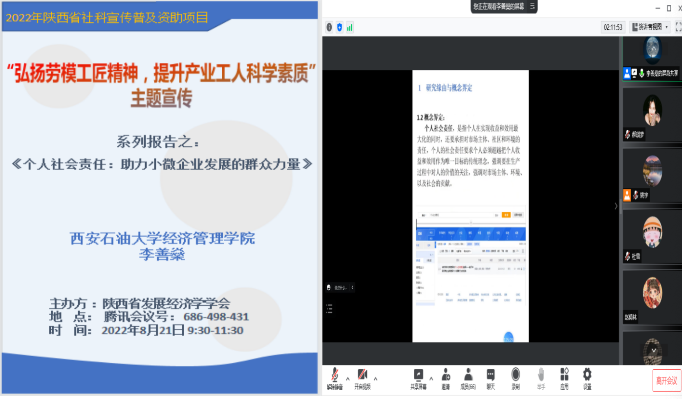 8月21日,陕西省发展经济学学会第十一期中发讲座在西安举办,本期活动的主题是“2022年小微企业发展思路:机遇与挑战”。本次活动由陕西省发展经济学学会和弘文讲堂共同主办。受疫情影响,本次讲座通过线上举行,来自陕西省内外高校和科研院所的专家学者及众多企业界人士共80余人参加了此次会议。经济管理学院李善燊、张优智两位老师参加了此次学术活动,李善燊老师应邀作了交流发言。
