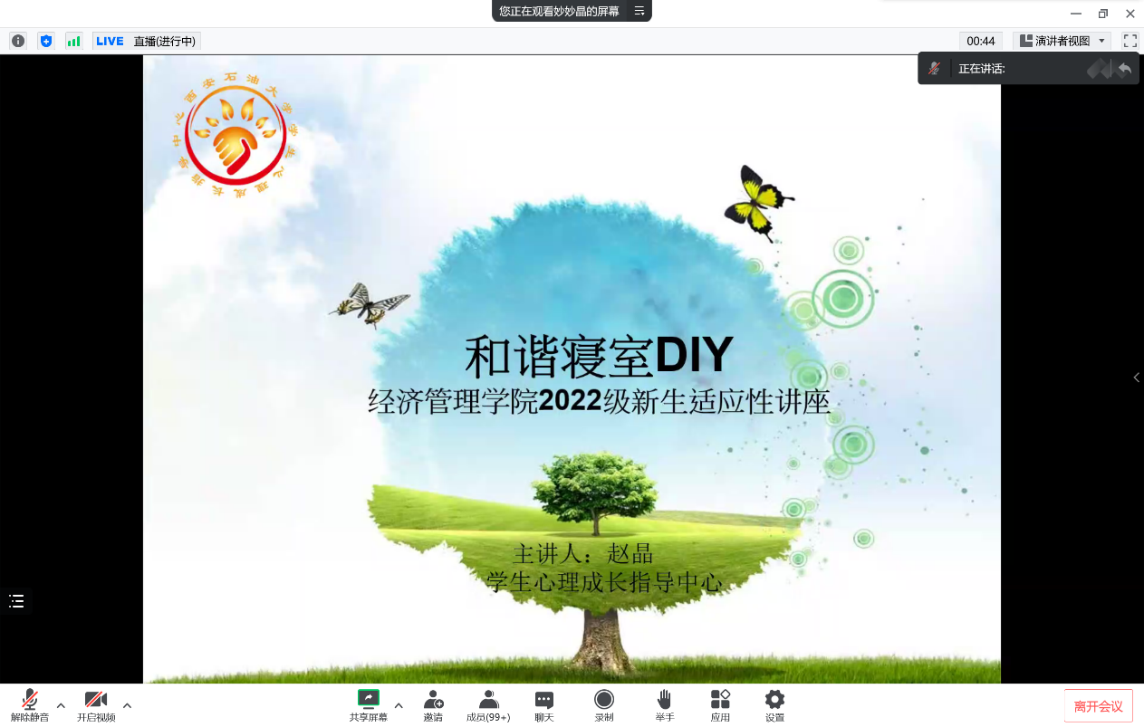 为切实做好2022级新生的心理健康教育工作,引导学生保持积极健康的心态,正确科学处理情绪问题,9月21日,经济管理学院通过腾讯会议线上举办2022级新生心理健康教育讲座。本次讲座邀请到我校学生心理成长指导中心赵晶老师主讲,学院全体2022级新生参加,2022级商管类专业辅导员任仰主持此次讲座。