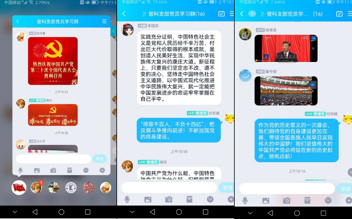 党支部组织了11位党员同志集体在线观看,个别同志在电视机前观看。休会期间大家在支部学习群内热议习近平总书记大会报告。