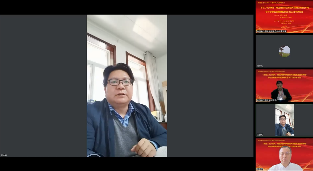 陕西省社会科学界联合会学会部部长张金高代表省社科联对会议的召开表示祝贺。张金高部长充分肯定了陕西省改革发展研究会作为省优秀学术社团在推动社科研究方面的作用,省改革发展研究会紧扣党的二十大精神,充分发挥理论研究优势、人才资源优势,以“增强消费对陕西经济发展的基础性作用”为主题,精心组织专家研究阐释党的二十大精神,争当学习宣传贯彻党的二十大精神的先行者、模范者,为奋力推进党的二十大精神贡献社科力量,具有重要的学术价值和现实意义。学习宣传贯彻党的二十大精神,是当前和今后一个时期社科界的首要政治任务,张金高部长鼓励社科组织和广大社科工作者都应充分认识党的二十大的重大意义,鼓励社科组织采取多种形式,营造浓厚氛围,掀起党的二十大精神的学习宣传贯彻热潮。