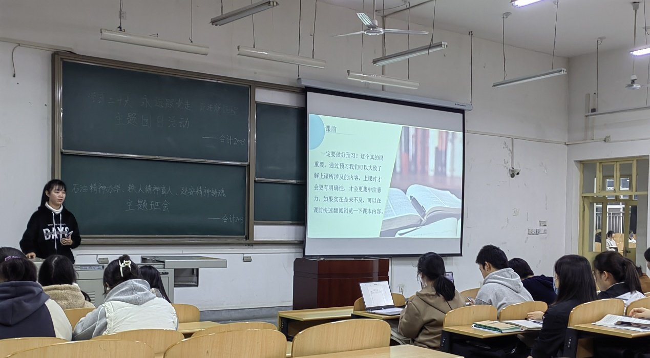 张琳婕、高明清、唐雯静三位同学结合自身经历,就思想、学习、科研、工作四个方面展开交流分享。在思想上,鼓励同学们积极向党组织靠拢,在志愿服务与社会实践中锤炼成长;在学习上,具体围绕高数和英语两门学科为同学们做出了指导;在科研方面,建议同学们从大一起积极关注并参与学科竞赛,积累参赛经验,力争优秀成果;在工作方面,分享了自身学生干部工作经验,鼓励同学们积极为班级做贡献,大胆细心,做好榜样。