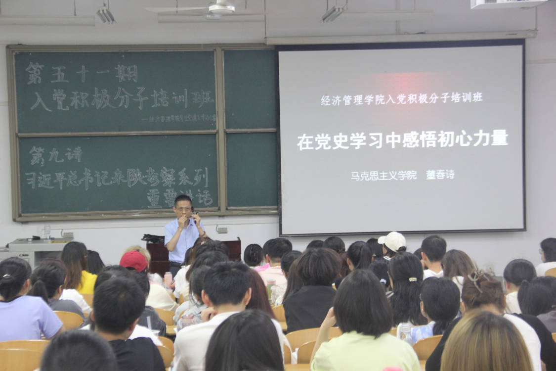为进一步提高入党积极分子的政治觉悟,树立正确的入党动机,5月17日,经济管理学院第五十一期入党积极分子培训班第九讲在博思楼114教室顺利举行。本次党课由马克思主义学院党委副书记、副院长董春诗主讲,第五十一期入党积极分子全体同学参加。