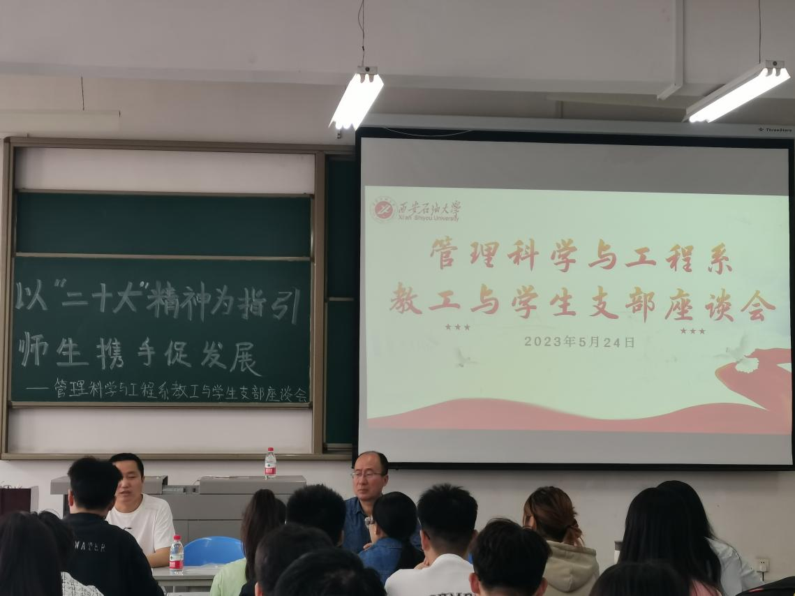 5月24日,为加强管科系学科建设、了解学生学习生活状态,经济管理学院管科系教工党支部与管科系学生党支部在鄠邑校区博览楼316教室开展党员座谈会。座谈会由管科系教工党支部书记刘军峰老师主持,管科系教工党支部部分教师、管科系学生党支部党员及积极分子代表参会。