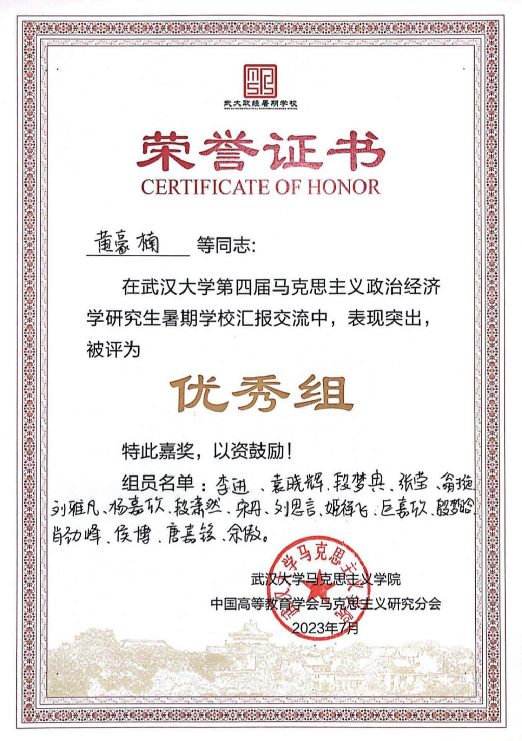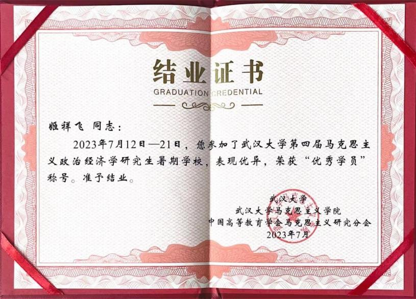 7月12日—21日,由武汉大学研究生院、中国高等教育学会马克思主义研究分会联合主办,武汉大学马克思主义学院承办的“武汉大学第四届马克思主义政治经济学暑期学校”在武汉大学举办。经济管理学院管理科学与工程专业2022级硕士研究生姬祥飞被录取为正式学员。