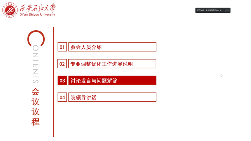 王君萍院长介绍了陕西省内其他高校对信管专业的调整情况,并强调本次学院专业调整是为适应社会经济发展而进行的,是经过深思熟虑之后的优化升级而不是简单的撤销替代,既是社会发展的必然趋势,也是专业建设的利好机遇。从学院整体发展和石油经济大趋势进行展望,指出主动进行专业调整的优势所在,以及改革对专业发展的重要性。