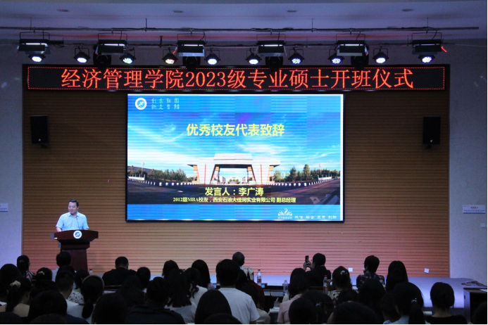 开班仪式在西安石油大学校歌《辉煌明天》的歌声中拉开帷幕。王君萍院长首先致辞,为2023级专业学位硕士的同学们介绍了学校和学院的发展历史,让同学们了解学院的办学优势和发展前景,并对同学们的加入表示热烈欢迎。王刚副书记和李春霄副院长分别从学生管理和研究生管理的角度对同学们提出期许和希望,希望同学们能迅速转变思维,尽快投入到研究生的学习中来。MBA项目负责人黄莉老师和MPAcc项目负责人宁宇新老师,分别介绍各自专业情况,也详细说明了在整个学习过程中同学们需要注意的事项,提醒同学们不要掉以轻心,祝愿大家学有所成。导师代表杨睿娟、吴勋也为同学们提出了要求、送上了祝福。优秀校友代表、2012级MBA学生、西安石油大佳润实业有限公司副总经理李广涛也为学弟学妹们分享了自己的学习体会和感想,同学们受益匪浅。MBA专业2023级新生姚大为和MPAcc专业2023级新生马博林同学作为新生代表发言,向学院和老师们表达了努力学习、提升能力的决心。提问交流环节,同学们踊跃提问,老师们耐心解答,为接下来三年的学习生活搭建起良好的沟通渠道。