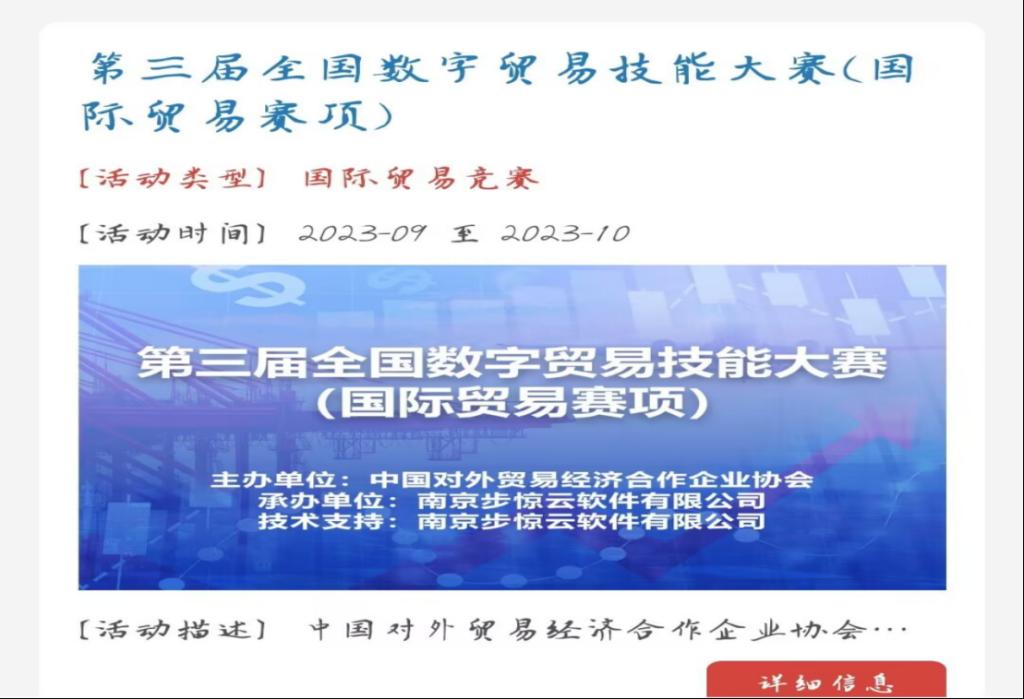 10月24日,由中国对外贸易经济合作企业协会主办的全国第三届数字贸易技能大赛落下帷幕。由我校经济管理学院国贸2101、国贸2102的全体学生、部分国贸(留学生)21级学生、国贸22级部分学生组成的21支参赛团队全程参与,并在白平老师的指导下顺利完结,共斩获一等奖1项、二等奖10项、三等奖4项,取得了优异成绩。