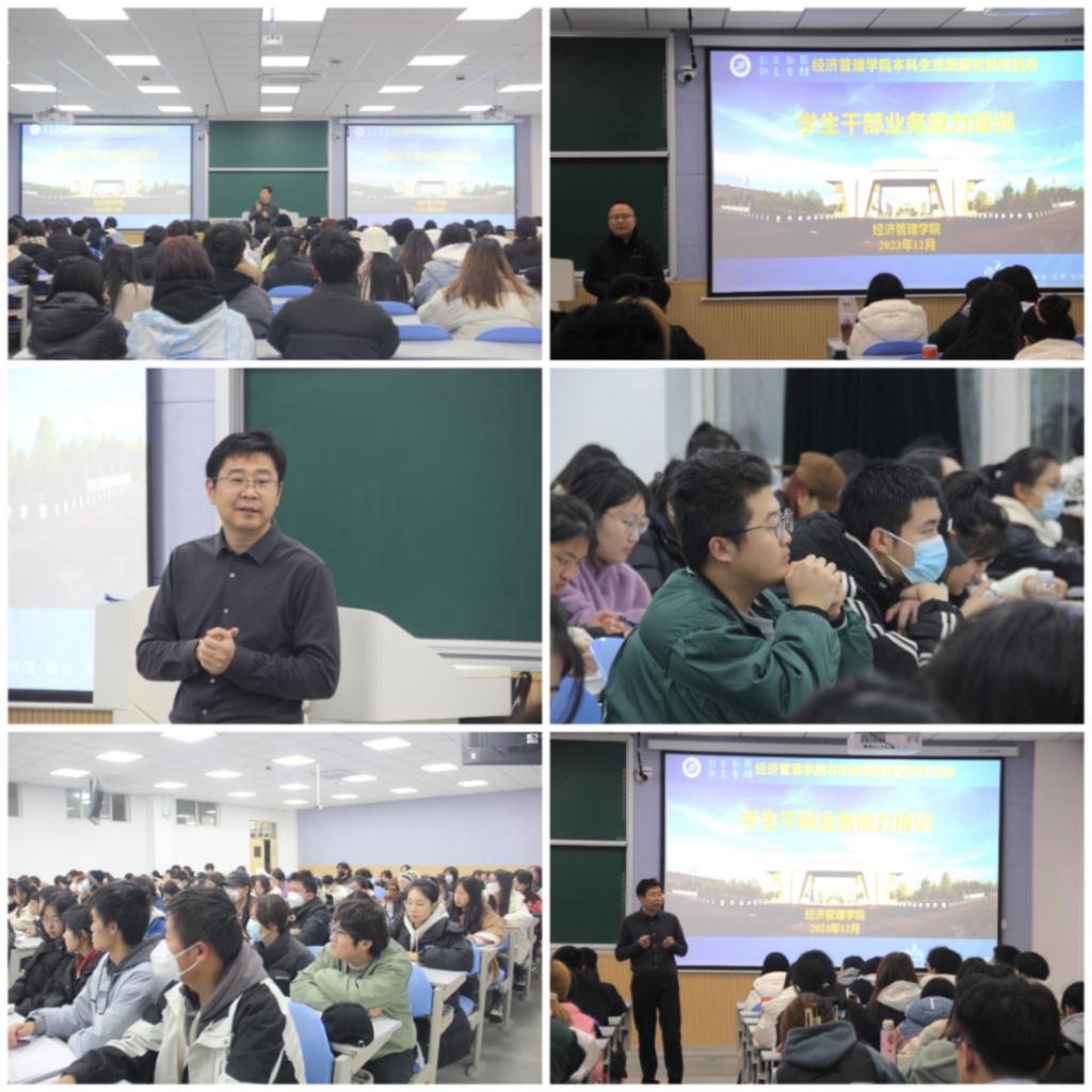 为进一步增强本科生班级建设工作成效,根据经济管理学院2023—2024学年第一学期本科生班级建设系列活动安排,12月14日,经济管理学院在鄠邑校区博览楼108智慧大讲堂开展学生干部业务能力培训。本次培训由学生工作部(处)部(处)长、就业指导中心主任王亮主讲,学院党委副书记王刚主持培训会,各年级、各班级“两委”主要学生干部,学生党建工作办公室副部长级以上干部,团学副部长级以上干部参加。