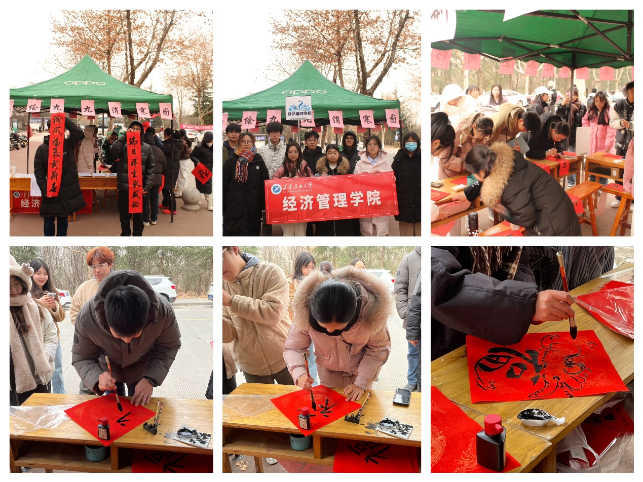 在新食堂外,学院举办了“共绘九九消寒图”“书写新春对联”“写福字”等活动。九九消寒图始于明代,与数九的民俗密切相关,是中国民间一种计算寒天与春暖花开日期的方法。写春联、写福字是中国传统而独特的文化,反映着中华民族文化底蕴的博大精深。学生们热情参与,写出一幅幅饱含吉祥寓意与祝福的春联与福字,在翰墨飘香中感悟传统文化。